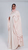 A softly structured ruffle cape-abaya in muted beige, designed for graceful movement and a polished, contemporary presence. Gentle tiered layers create a fluid silhouette that drapes like desert dunes at sunset — calm, elegant, effortlessly refined. The lightweight fabric enhances every step, making the piece feel both airy and intentionally sculpted.