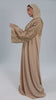 An A-flow silhouette accented with full bell sleeves and a sun-touched hand-beaded gradient, paired with meticulously placed featherwork that adds softness and couture-level dimension. The warm golden tone catches the light with every step, creating an elevated, enigmatic profile shaped with exquisite detailing and elegant movement.